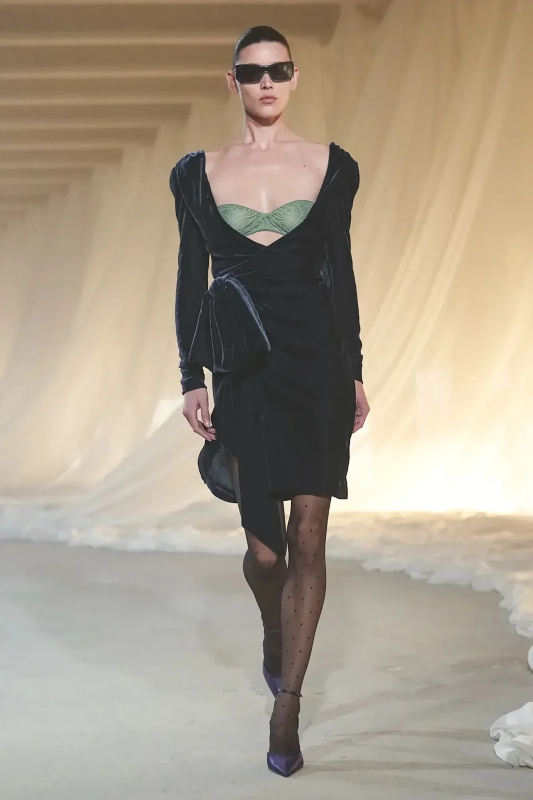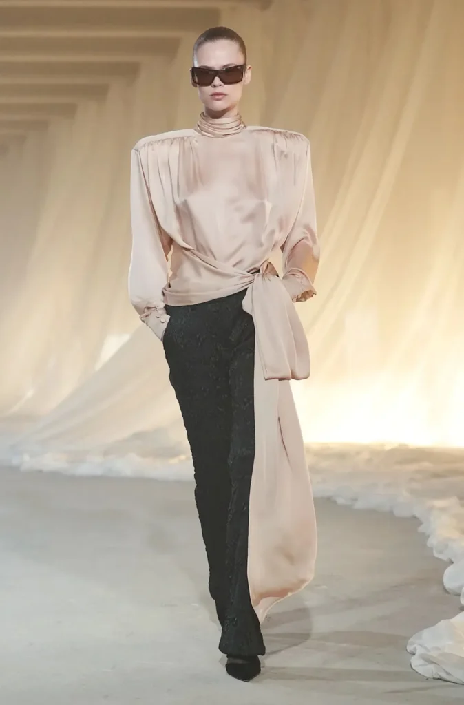 • Draped Silk Dresses: Lines that hugged the body without restricting it created a sensual, refined presence on the runway.